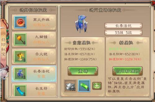 尽管只有绿色符印,但就目前游戏需求来看,提升自己的封印符印强度已经足够了,而且就关系来说,升级符印秘宝的等级和段数,所获得的收益并没有直接重铸属性来的痛快。重铸属性消耗的材料和大家升级段数消耗的材料一样,因此要优先进行重铸。重铸在符印秘宝中采用了比较科学的方式,即重铸属性后给予对比显示,当玩家看到所有属性都超出自己原有秘宝属性时,再确定替换来变为新属性。